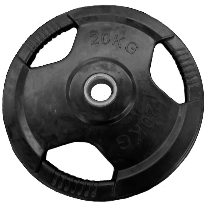 Szögletes peremű 20 kg-os, 51 mm-es belső furatú gumírozott súlytárcsa fekete színben. Megmarkolható furatokkal ellátott súlytárcsa, mely biztonságosan cserélhető és kompatibilis bármelyik típusú 50 mm-es súlyzórúddal.